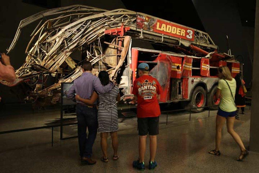 Sont exposés les restes d'un camion de la New York City Fire Department Ladder Company 3.